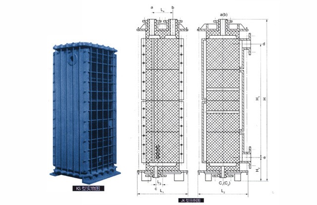 矩型塊孔式石墨熱交換器由截面為矩形的單元換熱塊疊裝而成,整體強度高,耐熱沖擊性能好,傳熱效率高使用壽命長,本公司常規生產均為內聯式單向耐 腐蝕JK型與KS型兩系列,JK型側板為小塊,規格變化容易維修方便,KS型側板為 整體,增加上、下兩排緊固鏍柱.載熱體 分布更均勻。相同換熱面積時矩形塊孔式 設備高度比圓塊式小。本公司可根據用戶 要求生產外聯式、臥式安裝,雙向耐腐蝕 等具有其它特性之矩形塊孔式石墨